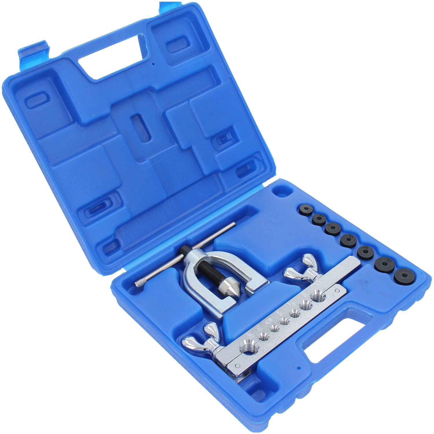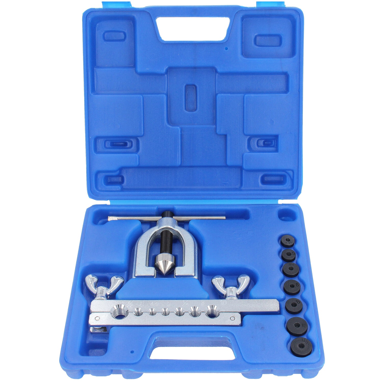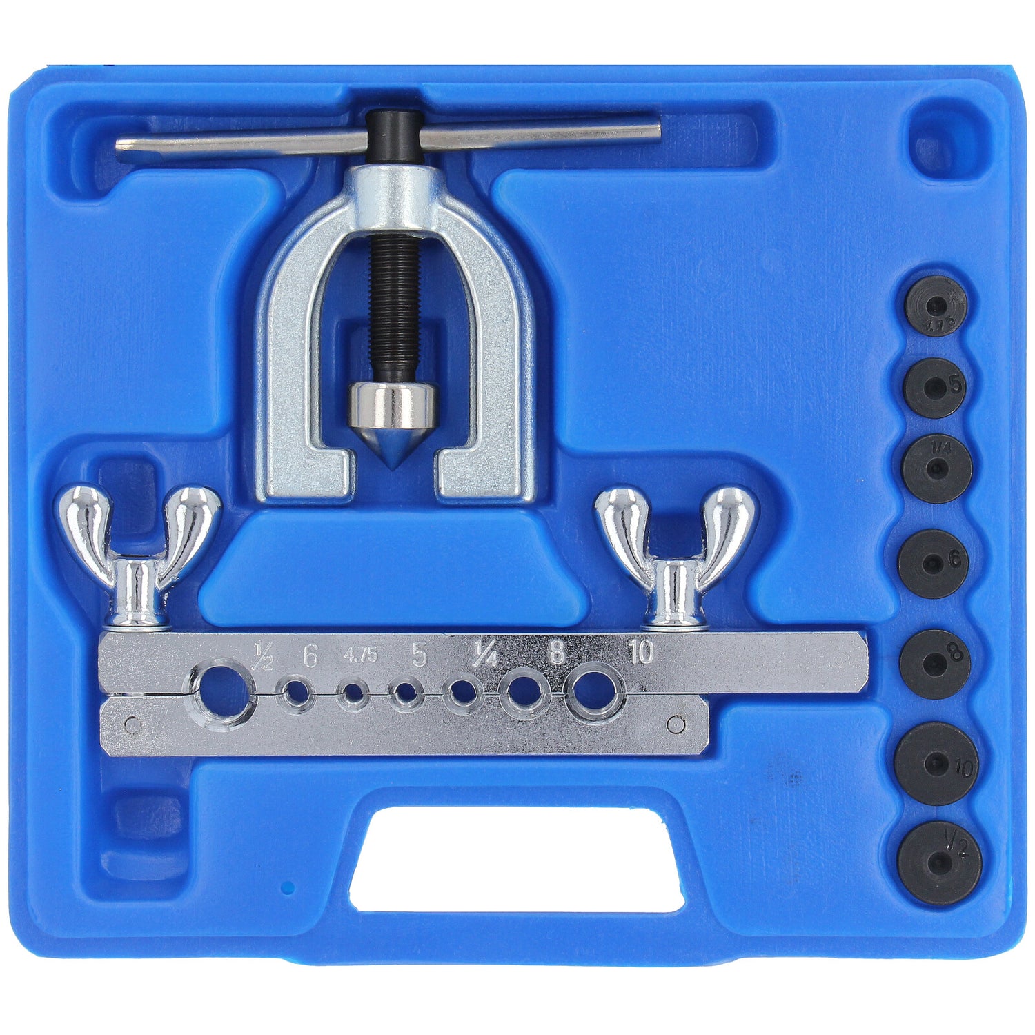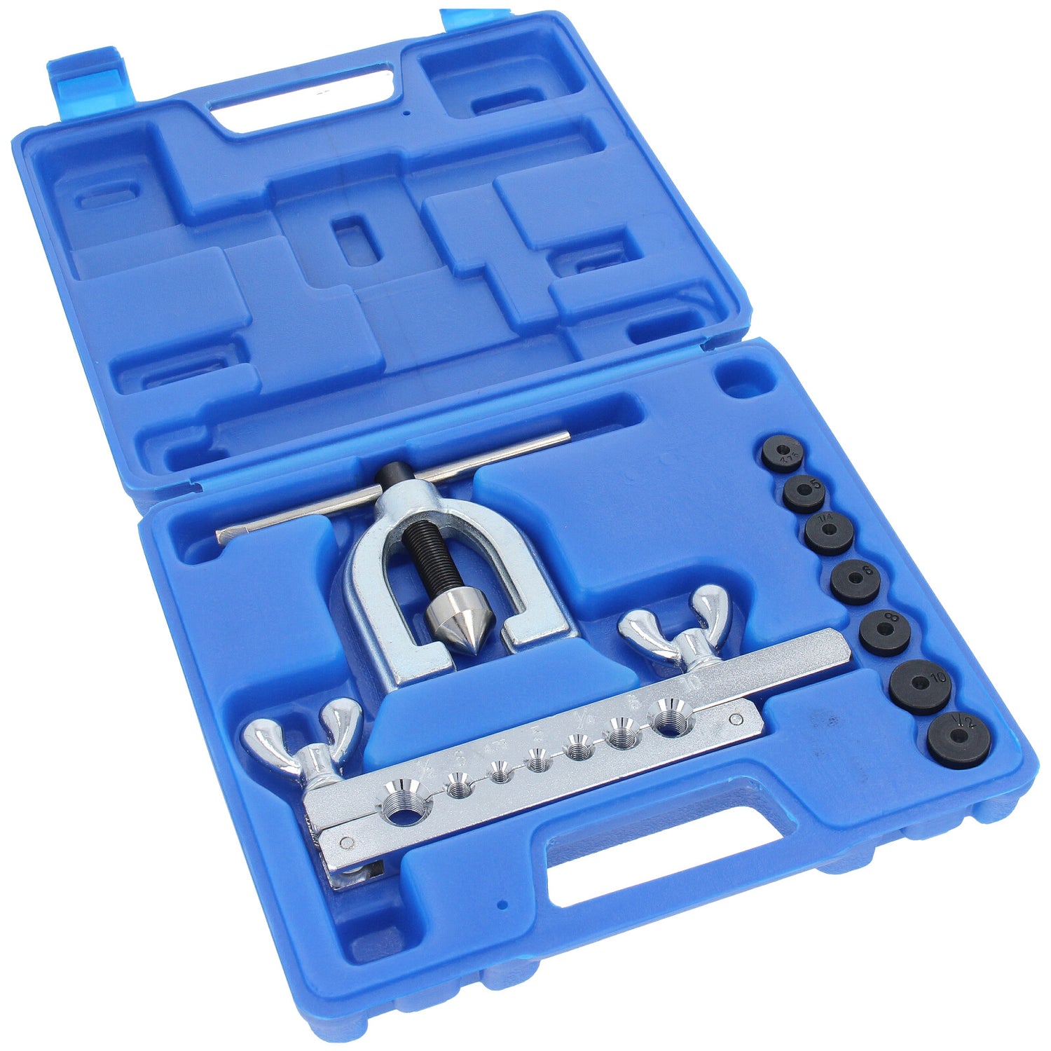 -> 7 zestawów szczęk bordujących w rozmiarach: 4,75 mm, 5 mm, 6 mm, 8 mm, 10 mm, 1/4" i 1/2" 1 x Bördelgerät