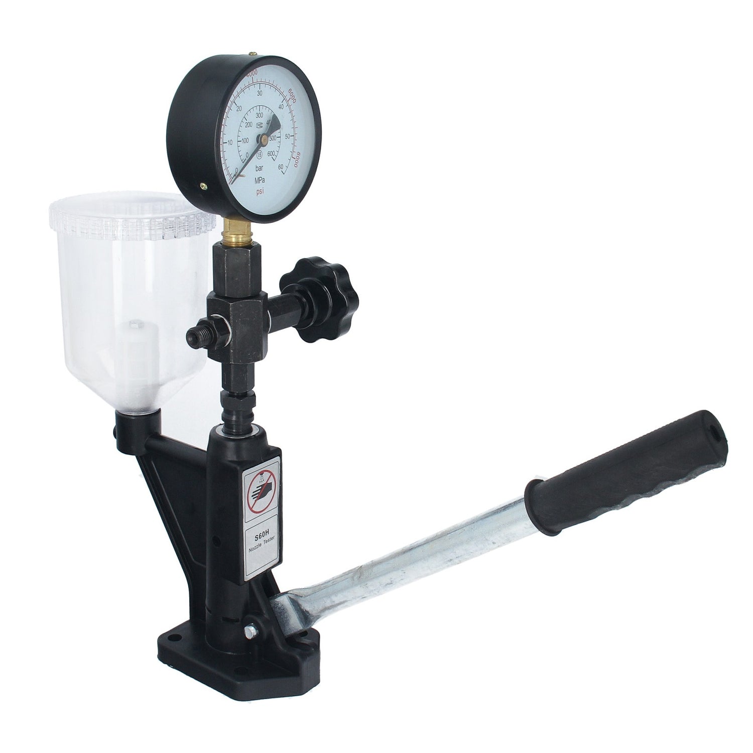 - Prüfgerät mit Kraftstoffbehälter, Handhebel und Druckuhr mit Gummischutzkappe zur genauen Prüfung von Einspritzdüsen